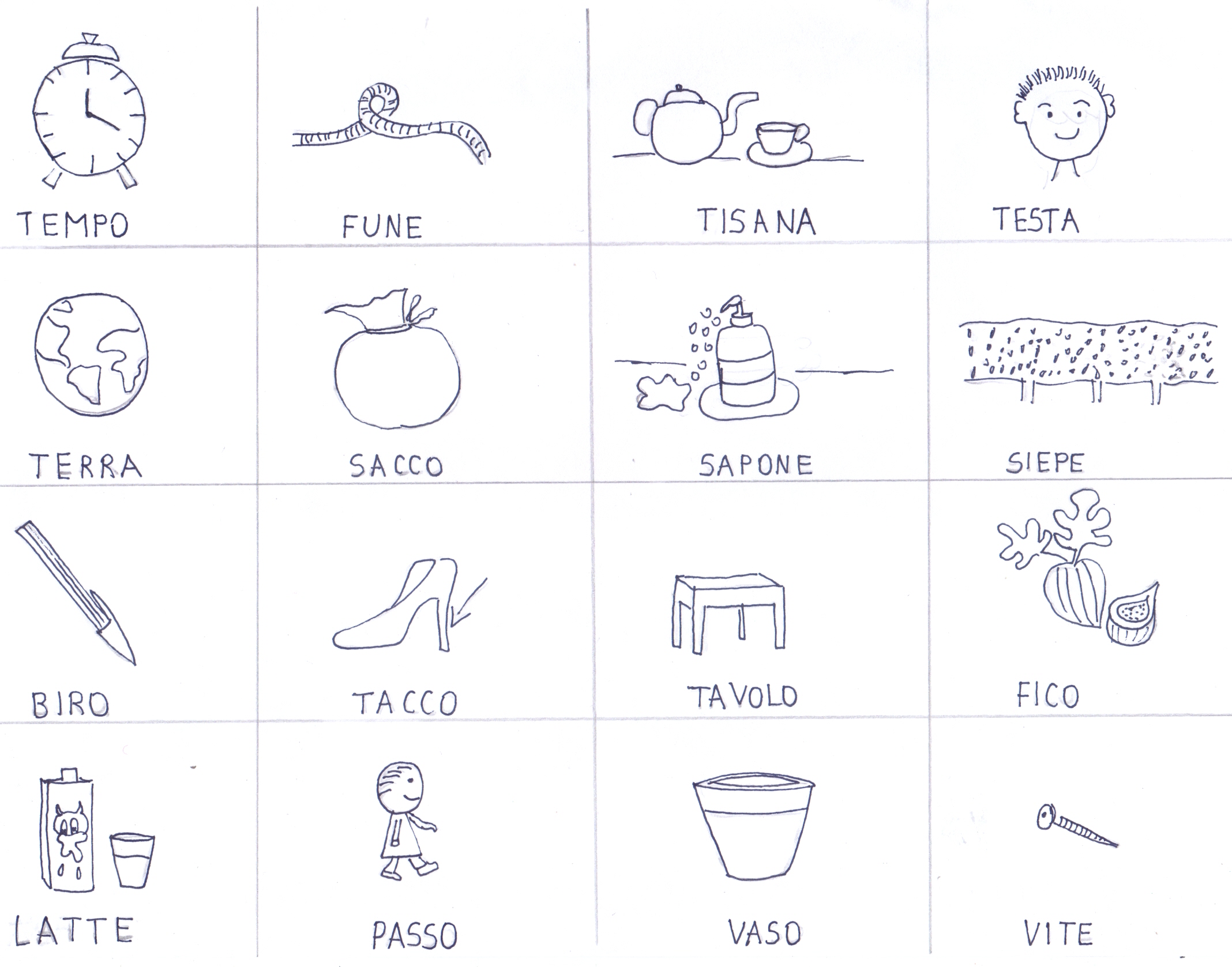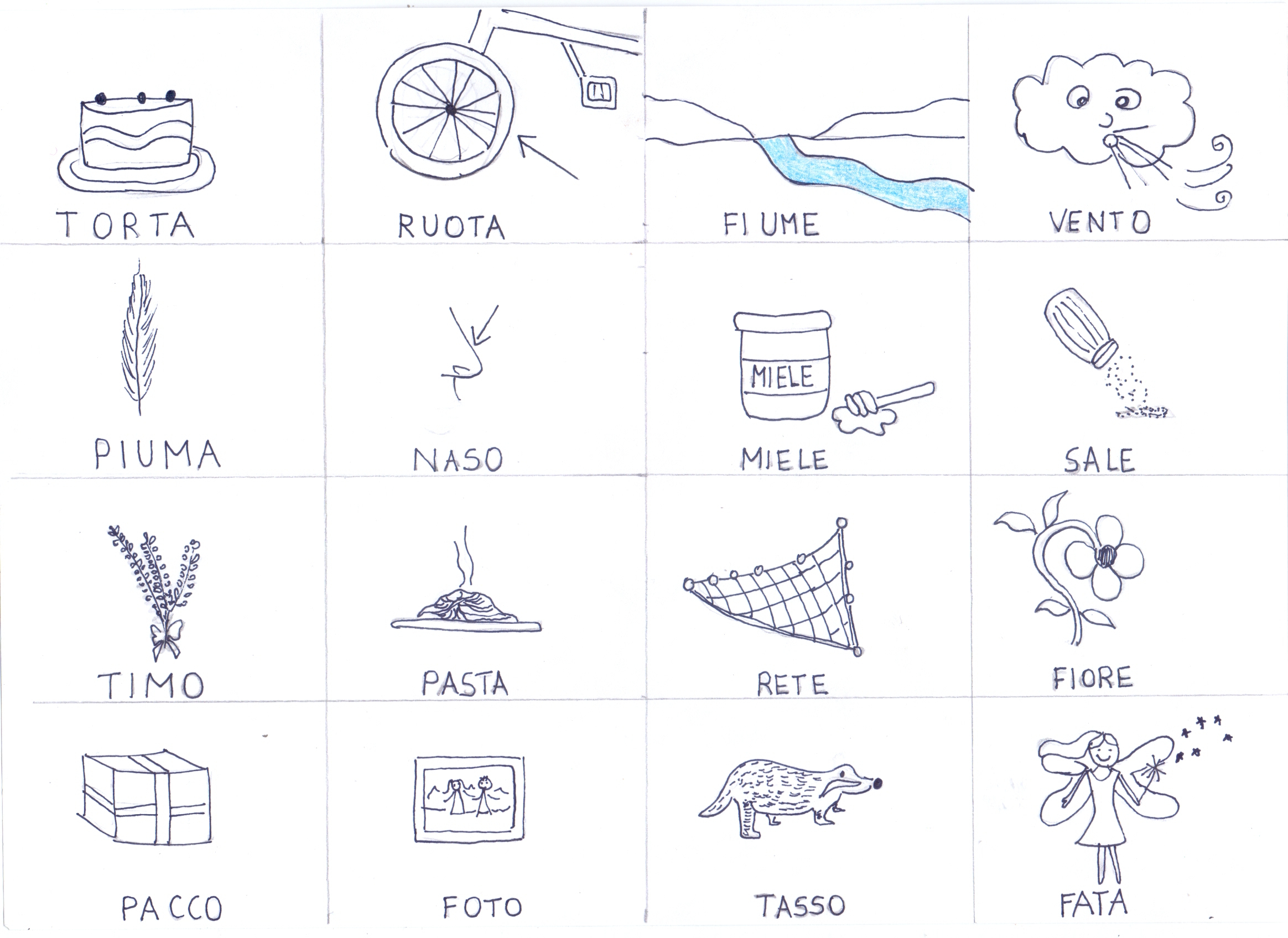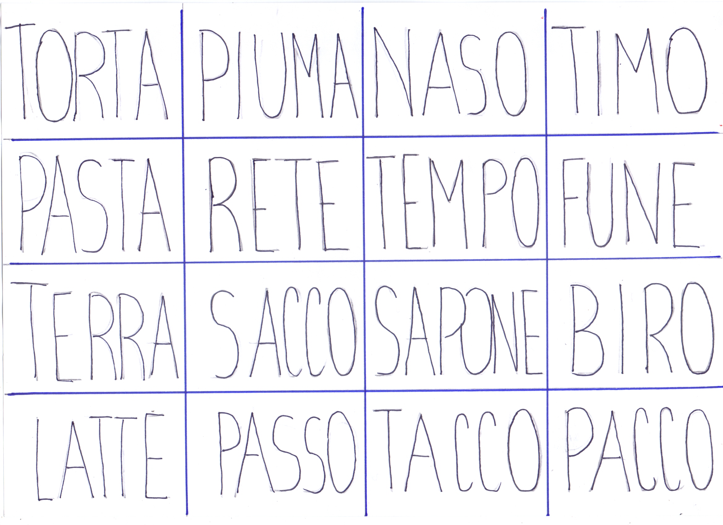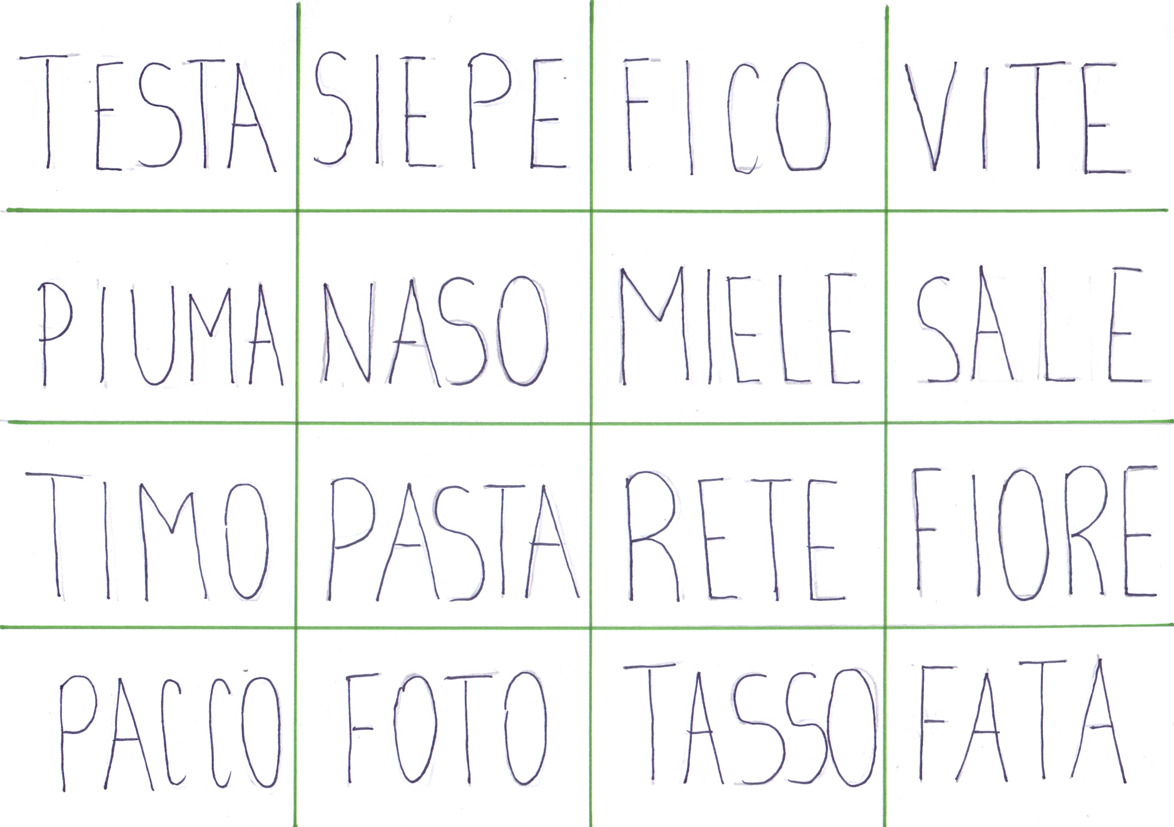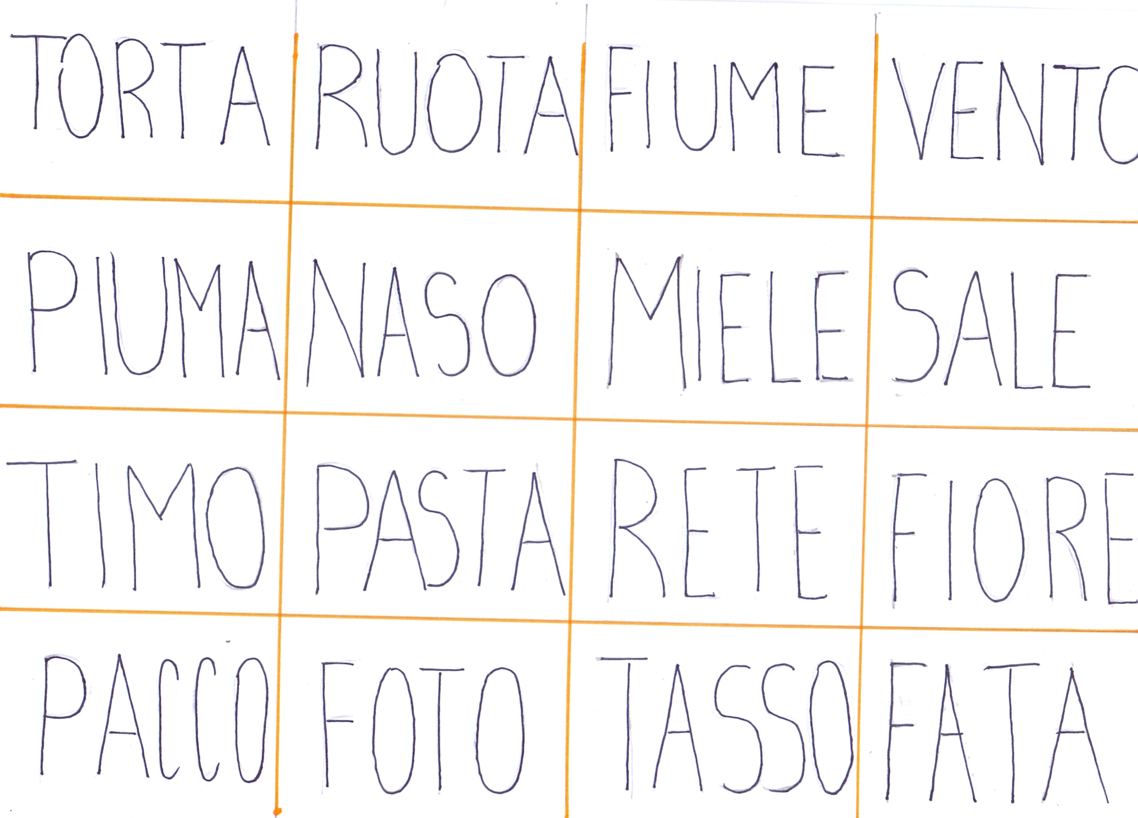 OGGI GIOCHIAMO AL GIOCO DELLA TOMBOLA. SIETE PRONTI? AD OGNI COPPIA UNA CARTELLA, OSSERVATELA BENE. Sì, NON CI SONO NUMERI MA PAROLE. LEGGETELE CON ATTENZIONE PRIMA DI INIZIARE IL GIOCO!