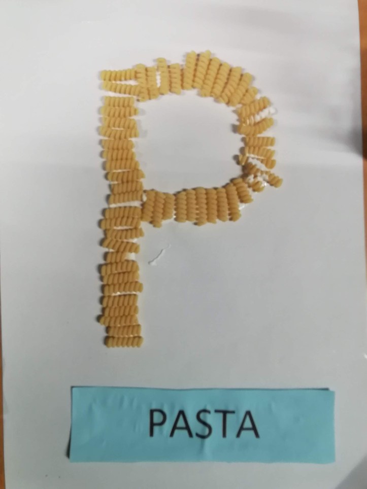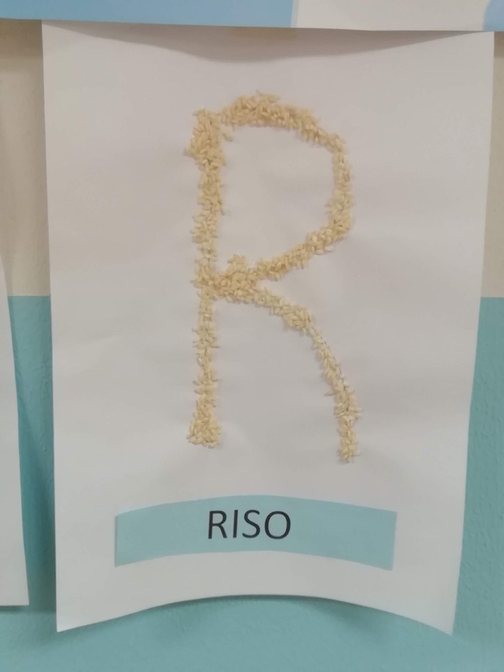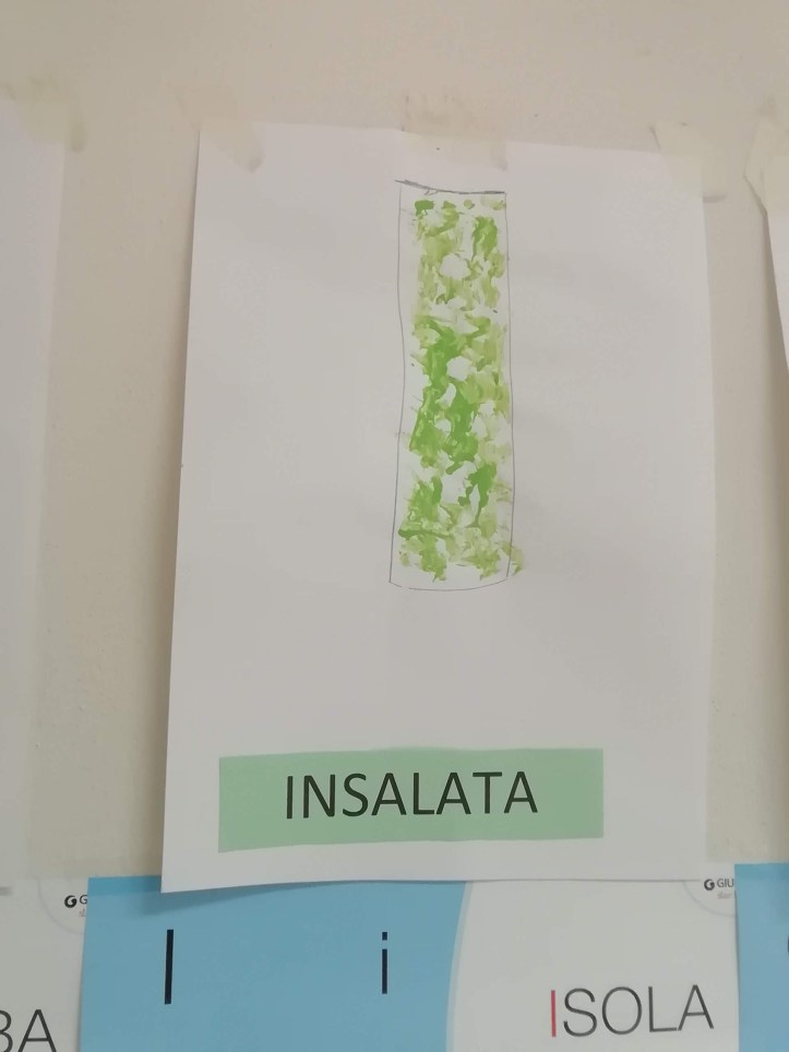 Per ogni lettera nuova presentata abbiamo utilizzato un materiale diverso per realizzarla: con l’insalata abbiamo costruito la I, con la pasta la P e così via. E’ nato così un alfabetiere murale colorato e allegro.