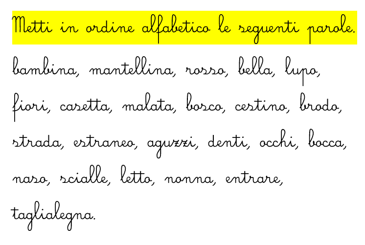 abbiamo costruito il nostro alfabeto dell’amicizia e ora giochiamo un pochino. Leggi le seguenti parole e mettile in ordine alfabetico sul quaderno.