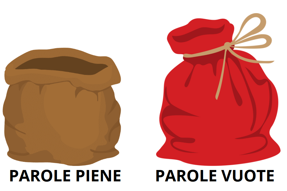 Presto lo scropriremo… prima però trasformiamoci in investigatori e giochiamo a classificare le parole. Prendete il vostro quaderno in orizzontale e disegnate due sacchi vuoti, grandi. Uno nella metà sinistra del foglio e l’altro a destra. Scrivete sotto al sacco di destra PAROLE VUOTE e sotto a quello di sinistra PAROLE PIENE.