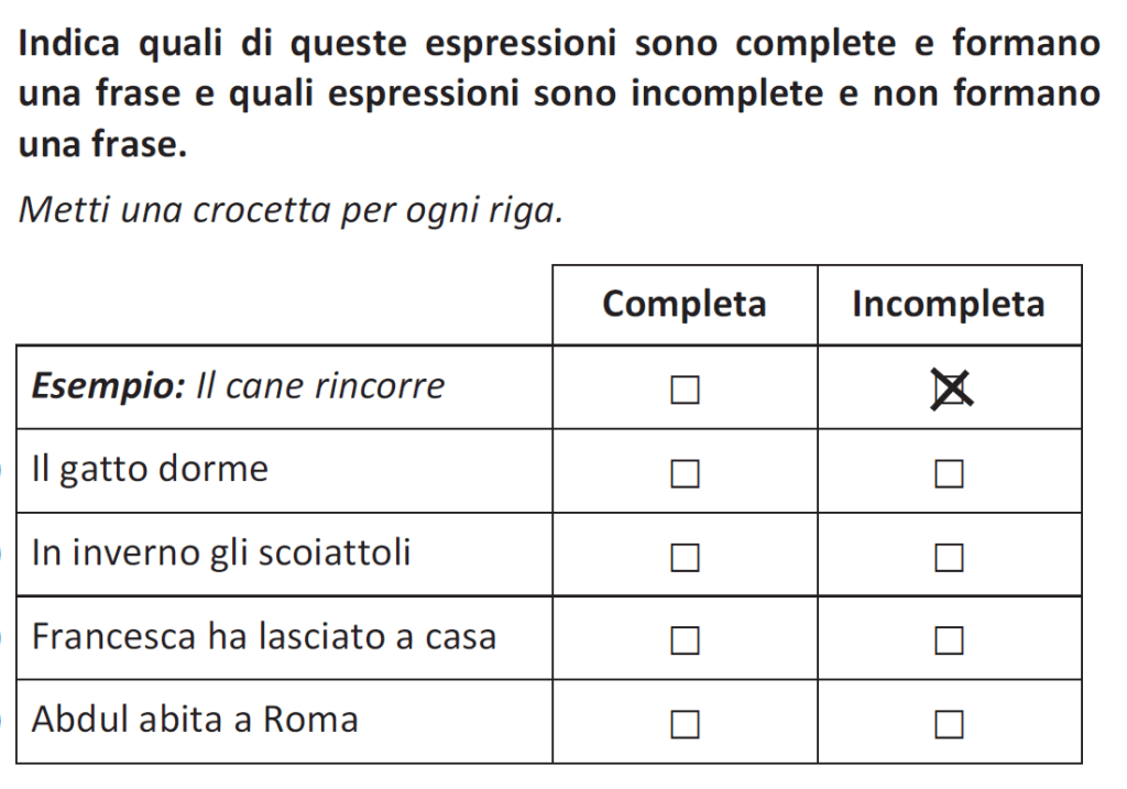 Provate ora a mettere in scena le frasi della tabella qui sotto. Ci sono le informazioni necessarie per metterle in scena? Se la risposta è sì, abbiamo una frase completa!