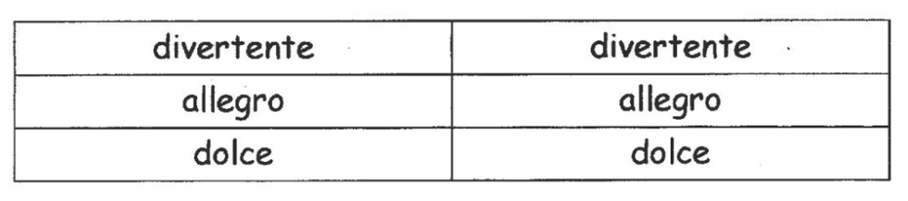 Al mio via, avrete 10 minuti per scambiare con i compagni i cartellini doppi, facendo attenzione a scambiarli con altri di significato simile. Per esempio, per la parola “allegro” potreste trovare gioioso, contento ecc…