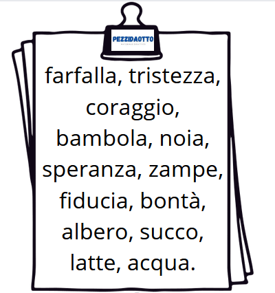 Ogni tavolo riceverà delle liste di parole. Al via un componente del gruppo legge le parole e gli altri bambini dovranno provare a disegnarle sul quaderno. Una volta terminata la lista, dovrete formare la famiglia dei nomi concreti e quella dei nomi astratti.