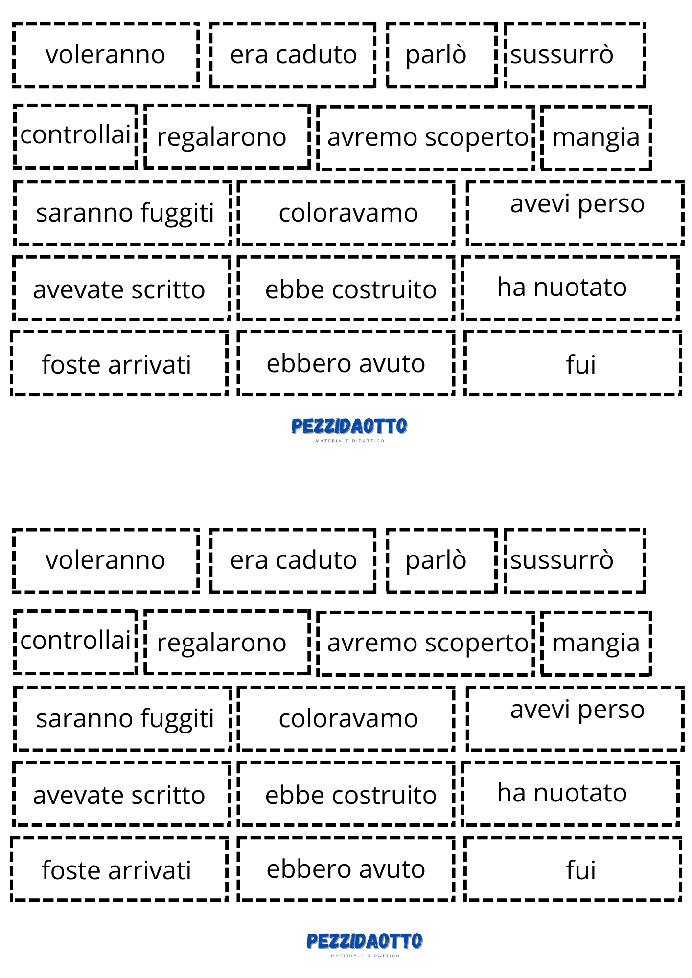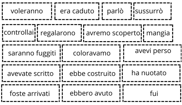 Girate il vostro quaderno in orizzontale e costruite una tabella con due colonne: una per i tempi semplici e una per i tempi composti. Riceverete poi dei verbi che dovrete collocare nella colonna giusta, precisando a quale tempo sono espressi.