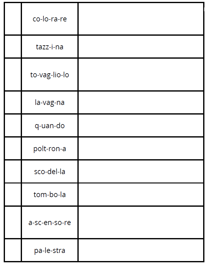 Colora di verde la prima casella della tabella se la divsione in sillabe è corretta e di rosso se non lo è. Nella colonna di destra correggi gli errori.