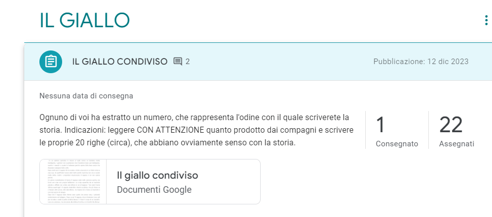 Ora comincia il bello: ognuno di voi dovrà scrivere una parte della storia, almeno 20 righe, partendo dal primo, che darà l’avvio, e via via proseguendo con gli altri ragazzi estratti. Lo potrete fare a casa, di pomeriggio, rispettando i tempi di consegna e lavorando su un file condiviso nella nostra Classroom.