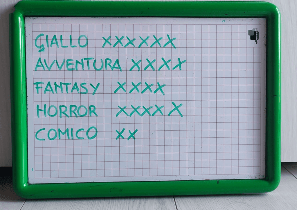 Per prima cosa, dobbiamo decidere che genere di storia vogliamo scrivere; e visto che non riusciremo mai a metterci d’accordo, meglio usare un metodo che non faccia torto a nessuno e che ci permetta anche di imparare come funziona la democrazia. Scriviamo su una lavagna i generi che abbiamo conosciuto durante l’anno e su cui ci siamo esercitati, poi chiudete gli occhi, perchè il voto rimanga segreto. Man mano che leggerò i nomi dei diversi generi, alzerete la mano per manifestare la vostra preferenza, che verrà registrata. In questo caso, ha vinto il GIALLO.