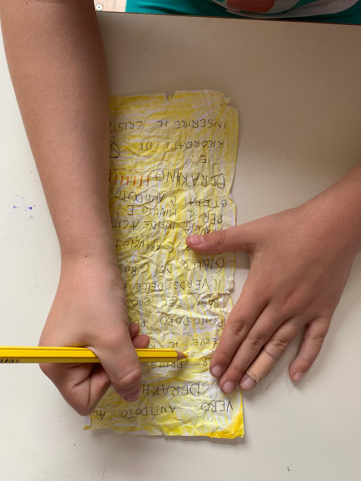 Ogni step di scrittura si è rivelato generativo anche dal punto di vista della possibilità di conoscere e approfondire i meccanismi di costruzione e scomposizione di un testo. Ogni laboratorio di scrittura conteneva, per i più grandi, spunti per osservare più da vicino alcuni strumenti importanti come l’uso dei discorsi diretti, la descrizione soggettiva, le sequenze narrative. Il fatto di affidare ad ogni gruppo di scrittura una parte differente del racconto ha permesso di personalizzare i percorsi di approfondimento testuale, successivamente condivisi nel grande gruppo. Prendiamo ad esempio esplicativo il momento in cui i due personaggi si incontrano. Siamo nella scuola di magia e il lavoro di scrittura è così suddiviso.