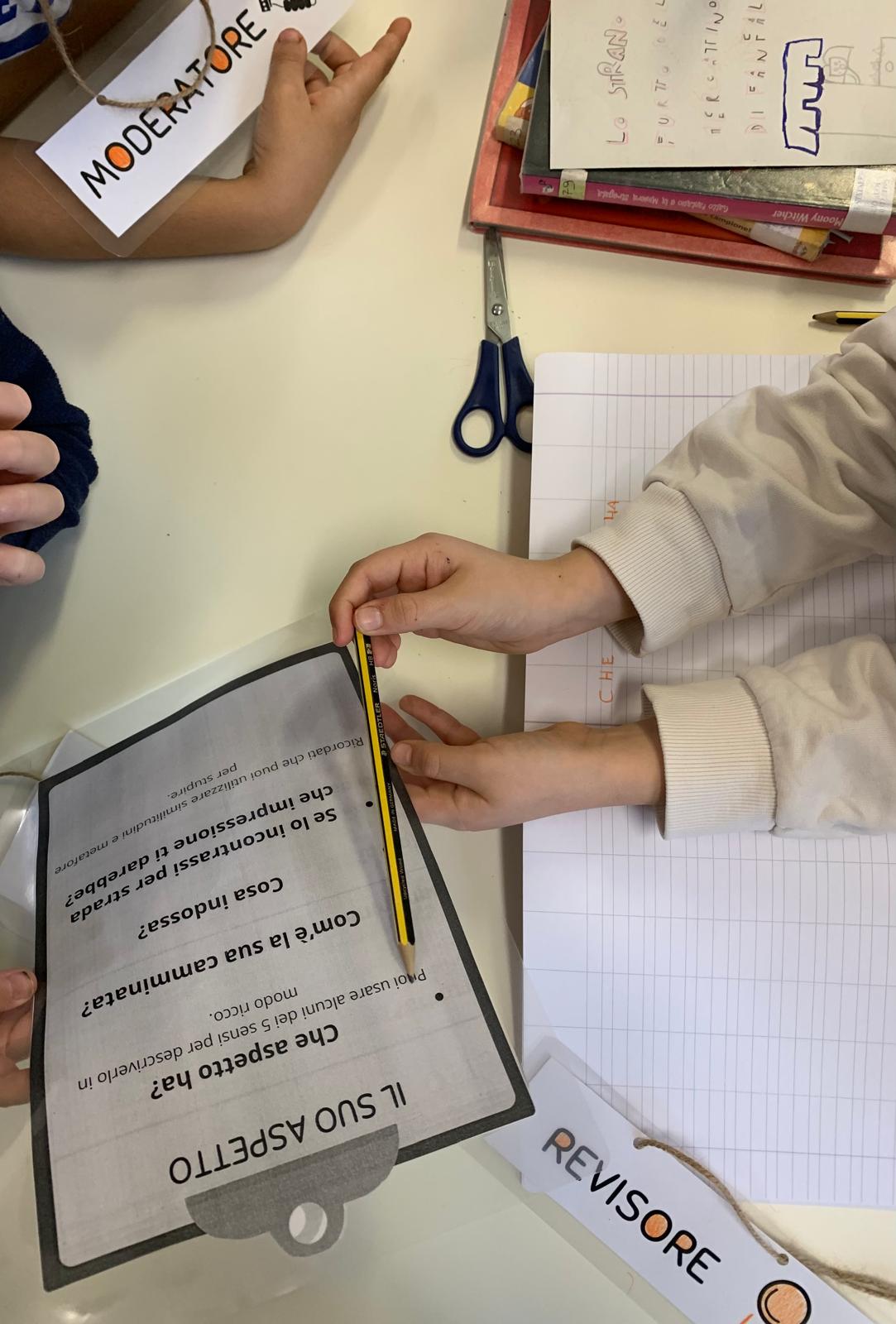 Per favorire la cooperazione e permettere la partecipazione attiva di ogni membro, sono stati distribuiti dei compiti precisi, che i bambini si scambiavano periodicamente, per permettere a tutti di assumere tutti i ruoli. In ogni isola si trovava così uno “scrittore”, che si occupava della trascrizione delle idee; un “lettore” che si occupava di verbalizzare le idee fino a quel punto fissate sul foglio; un “revisore” che si occupava del controllo ortografico e grammaticale e infine un “moderatore”, che aveva il compito di mediare tra le diverse idee emerse nel gruppo e trovare soluzioni in caso di piccoli dissidi.