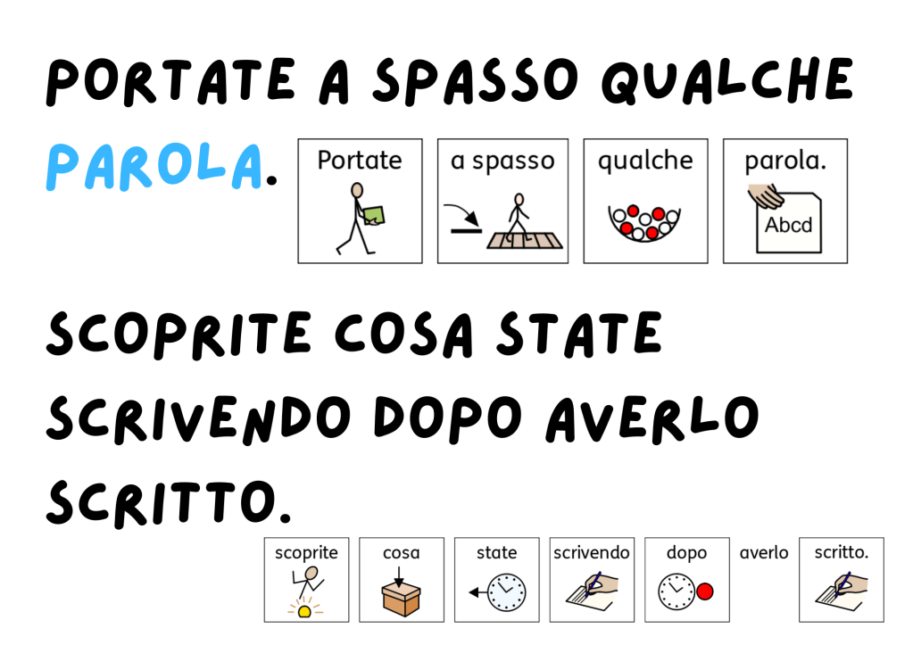 Portiamo a spasso ora qualche parola che vi racconti oggi, al vostro primo giorno di scuola. Scrivetele su un foglio e condividetele con i compagni.