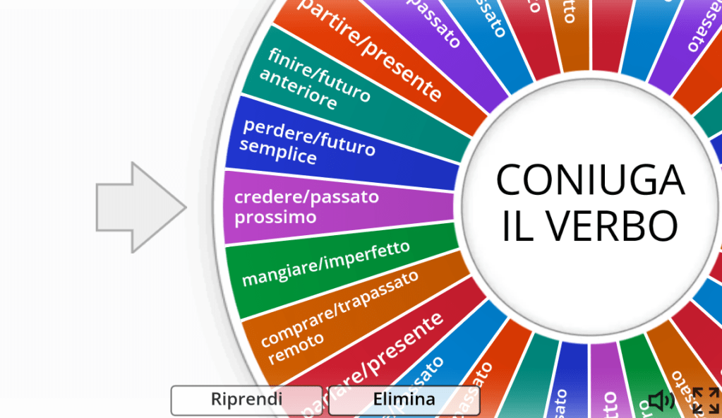 CLICCA QUI per giocare on line oppure stampa la griglia e plastificala, otterrai una lavagnetta da utilizzare per giocare con i tuoi amici. Un tavolo alla volta girerà la ruota della fortuna e avrà 3 minuti per coniugare il verbo trovato sulla tabella. Allo scadere del tempo, la squadra vincerà un punto se il verbo è stato coniugato correttamente. Pronti?