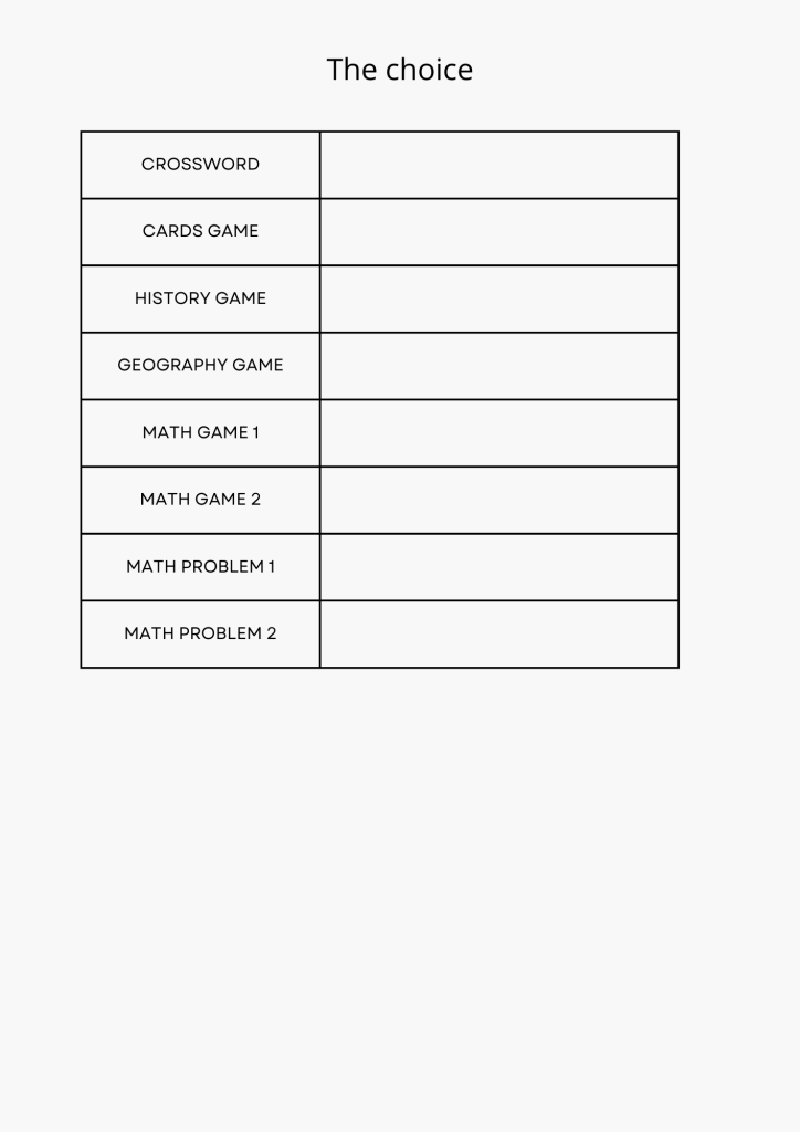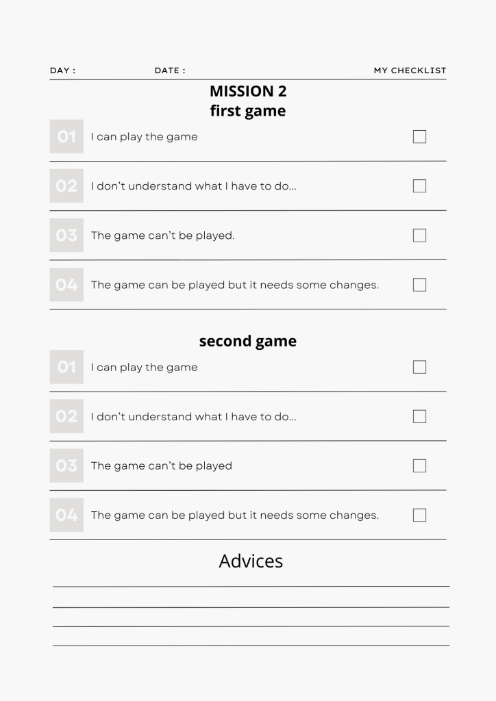 Dividetevi nei gruppi di lavoro concordati e provate a far giocare i vostri compagni con il gioco che avete costruito. Avete 15 minuti di tempo. Poi dovrete completare la griglia e scegliere due giochi che volete inserire nella vostra missione. Attenzione però, il gioco si fa difficile… perché la griglia è in inglese!!!