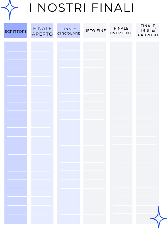 Una volta che siete riusciti a collocare tutti i testi in una di queste colonne, dovrete scegliere che genere di finale volete dare alla storia di Max e Leo. Preferite un finale aperto, oppure un finale in cui la situazione torna uguale a quella di partenza? Volete un finale lieto o triste? Divertente o pauroso?