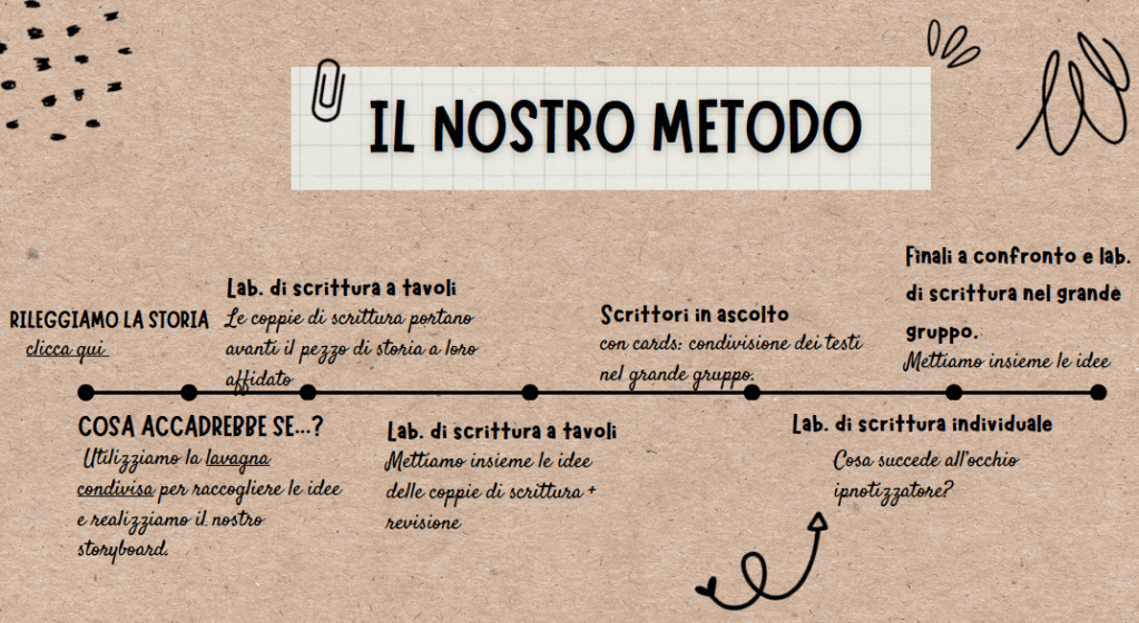 ho modificato la nostra time-line, perché durante SCRITTORI IN ASCOLTO avete deciso di approfondire il finale. Vi siete accorti, infatti, di non aver scritto che fine ha fatto l’occhio ipnotizzatore. Abbiamo così riaperto il nostro laboratorio di scrittura e sono venuti fuori dei testi meravigliosi!