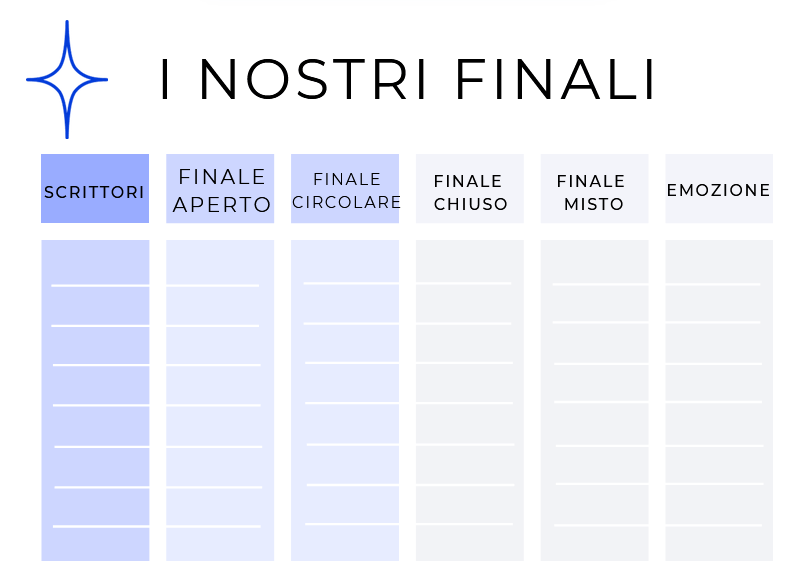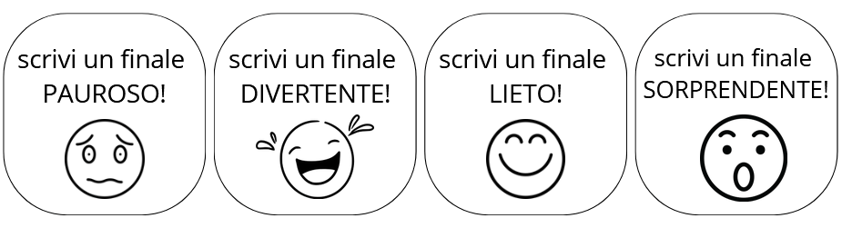 Come potete vedere i finali sono legati a delle emozioni e sarà proprio una di queste carte che vi guiderà nella scrittura. Alla fine del lavoro ogni storia avrà finali differenti e sarà interessante ascoltarli e confrontarli con quelli dell’autore. Potete scegliere voi se scrivere un finale aperto, oppure un finale in cui la situazione torna uguale a quella di partenza, o ancora un finale chiuso dove tutto si risolve. L’importante è che l’emozione sia quella che avete pescato e ad essa corrisponda la vostra narrazione.