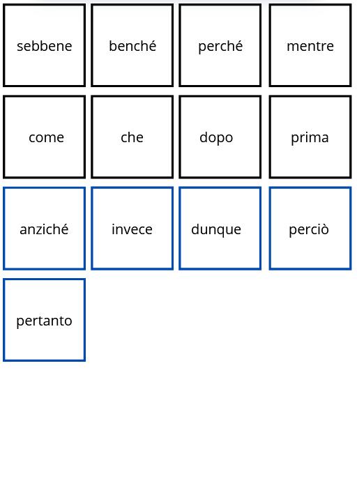 Tagliate i cartellini e costruite un mazzo di carte. A turno pescatene una e provate a costruire un PERIODO, cioè una frase complessa che sia tenuta insieme dalla parolina gancio che avete pescato.